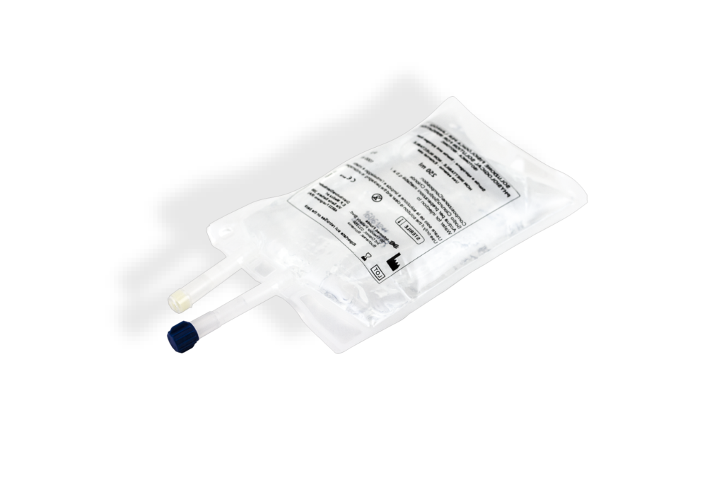 - Intiepidire la sacca con la soluzione a 38°C circa, immergendola in acqua calda. Quindi togliere, svitandolo, il tappino di protezione.